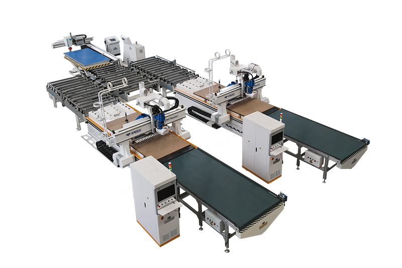 一拖二開料單元是一套自動化程度比較高的數(shù)控開料解決方案。開料單元由一臺高速自動貼標機、兩臺全自動數(shù)控開料中心以及動力滾筒線、中控系統(tǒng)組成。人工只需將板材放置在升降機上,由貼標機自動貼標,再由中控系統(tǒng)自動分配至開料中心,完成板材切割工作。如選配機器人系統(tǒng),可由機器人完成碼垛,余料利用及廢料輸出等工作。